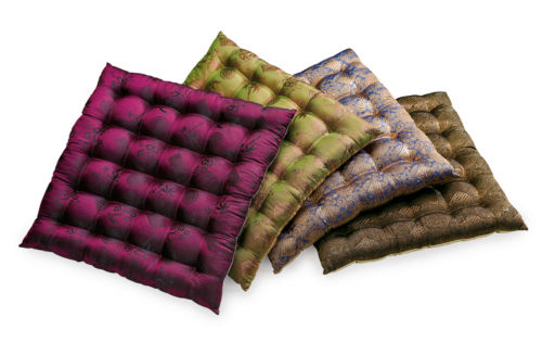 | Silk Meditation Cushion From CraftBeauty, a fair trade group Hand-dyed and loomed silk is hand-tufted into exquisite cushions by people in a vocational-training program to support the disabled in Hanoi. Natural cotton fill. 14″ square. Espresso, blue, sage or purple. |